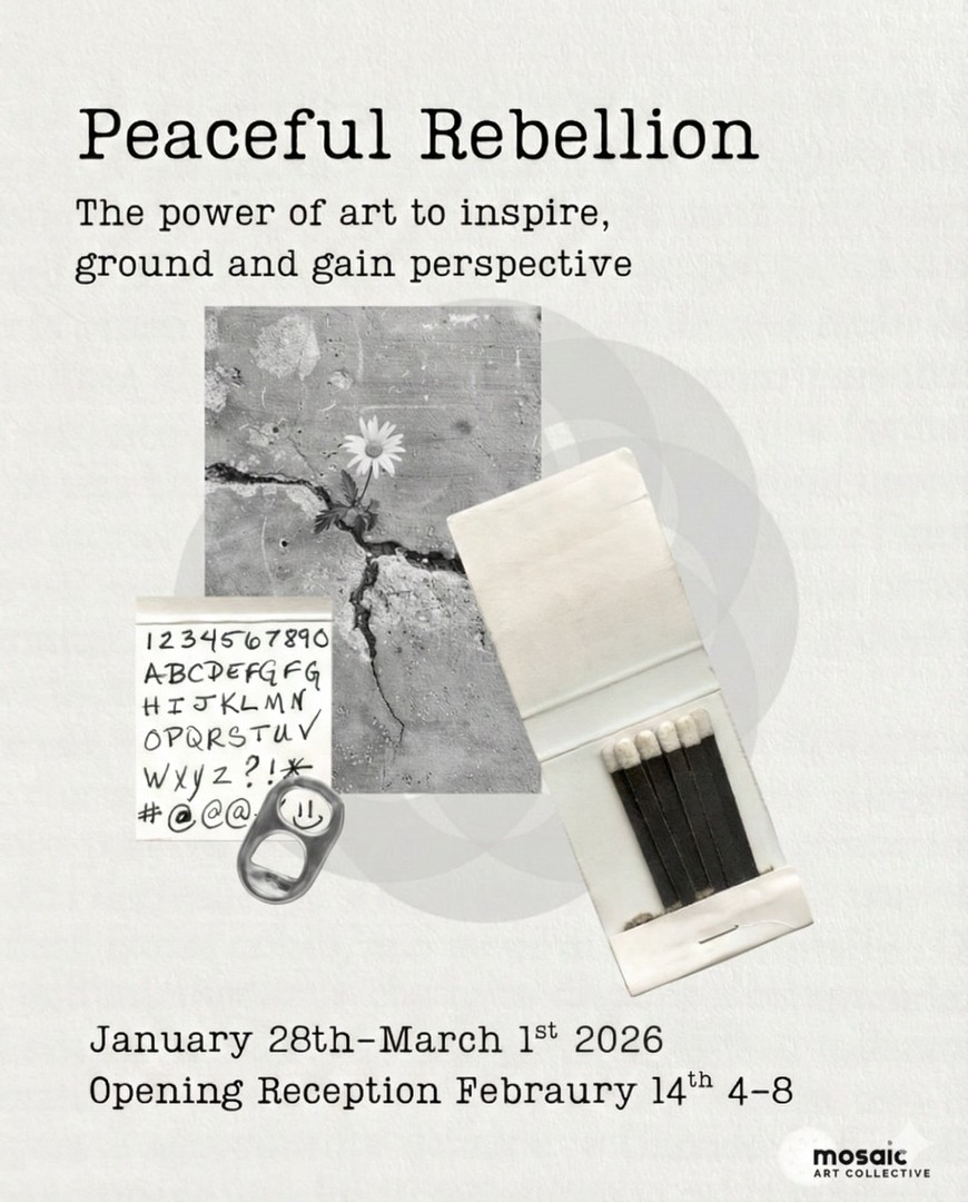 The story of of our experiences is told through art. Artwork can develop our sense of calm and ground us, it can call attention to the deeds and action of our communities, and it can provide perspective for the societal landscape we are navigating. Mosaic Art Collective invites local artists to submit work for Peaceful Rebellion. This open call is for works that celebrates the act of art making and the awareness and solace it provides us. We’re seeking original pieces in any medium in the scope of this theme.