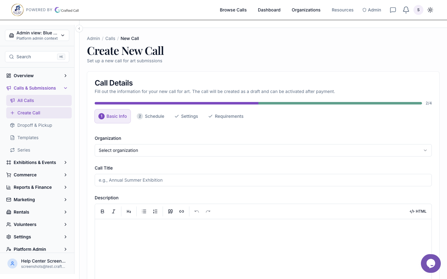A "call for artists" on Crafted Call is an open opportunity for artists to submit their work for consideration. This guide walks you through creating your first call, from setup to publishing.